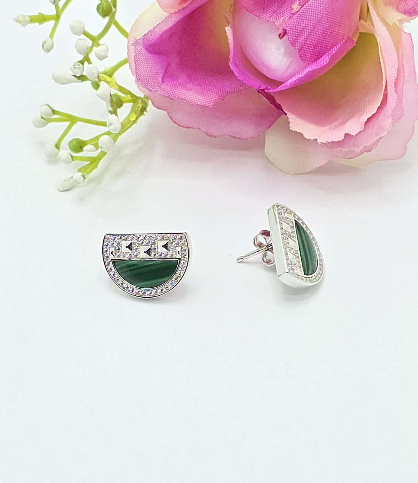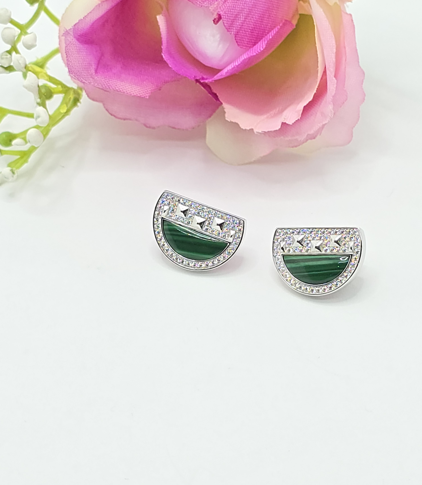Cercei din argint 925 cu insertie de malachit ,având o greutate de 6.13 g și dimensiunea de 1.8 cm. Un accesoriu minunat și strălucitor, perfect pentru orice ocazie.Inchidere surub.