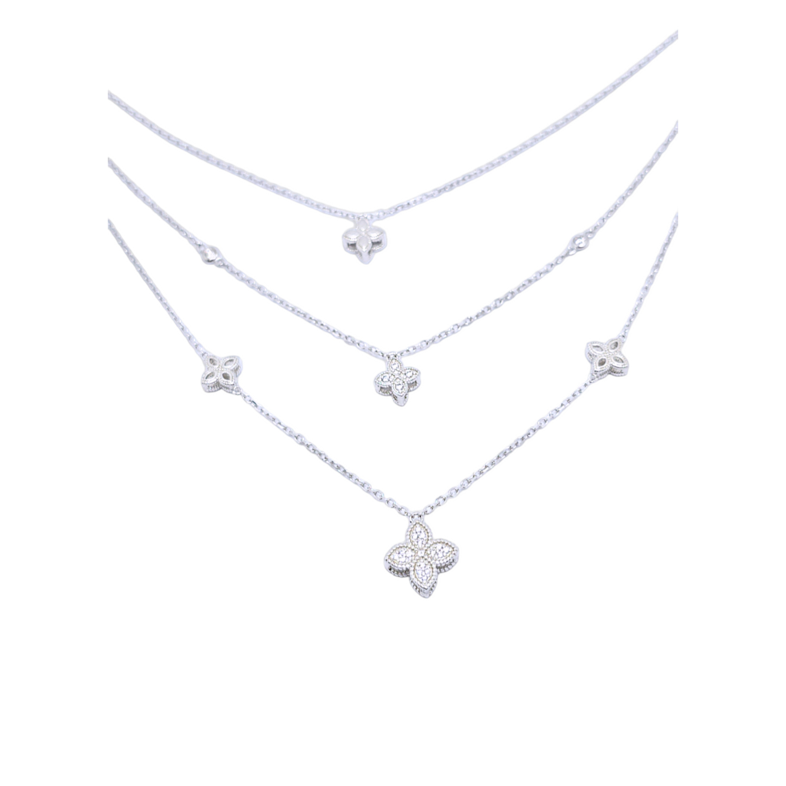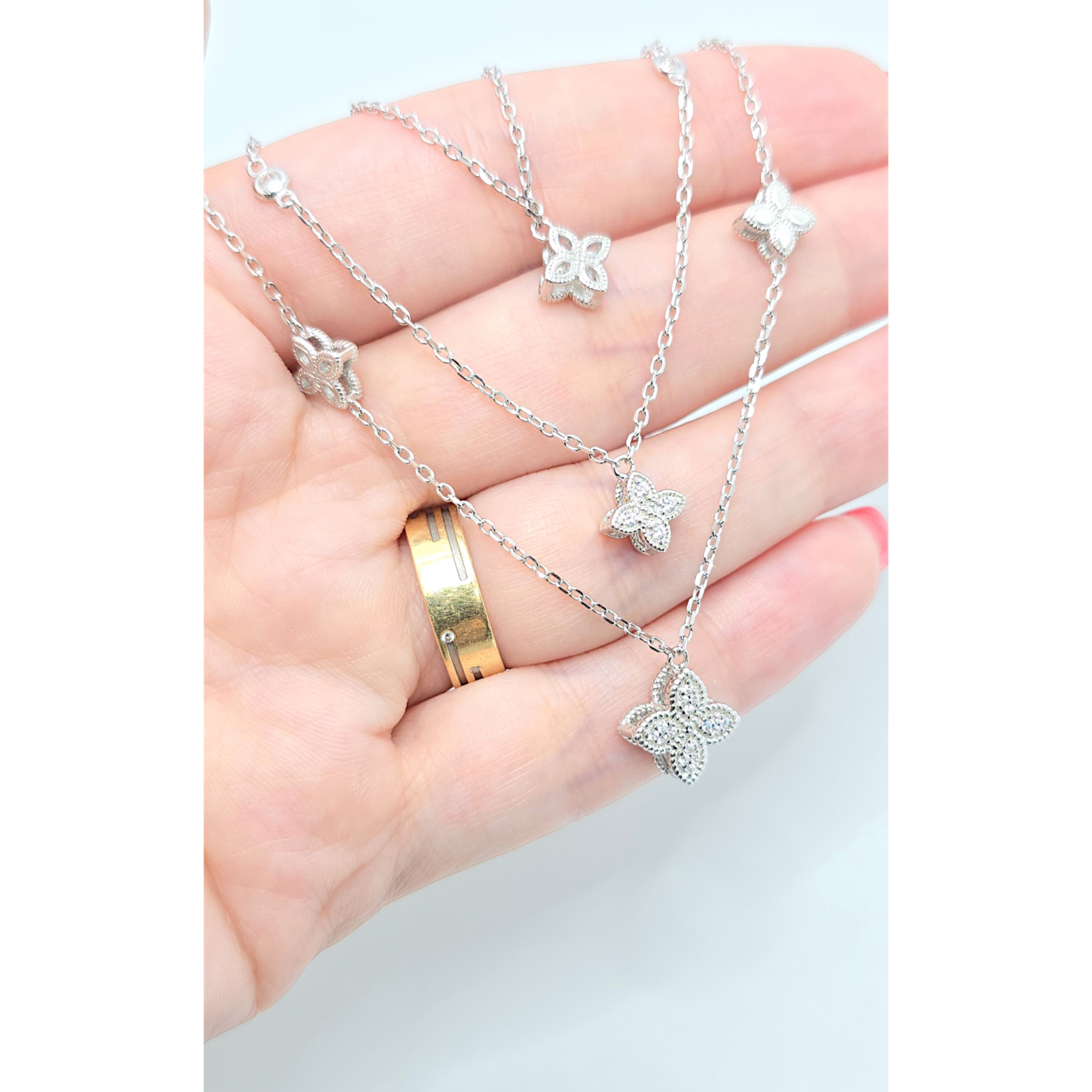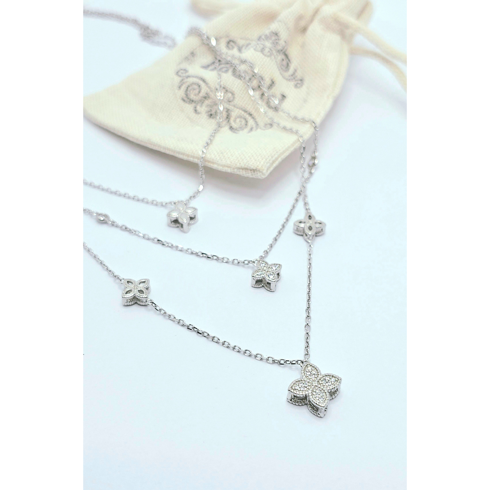 Pandantivul de trifoi este decorat cu cristale zirconia care adaugă un plus de strălucire și rafinament, captând lumina într-un mod subtil și atrăgător.