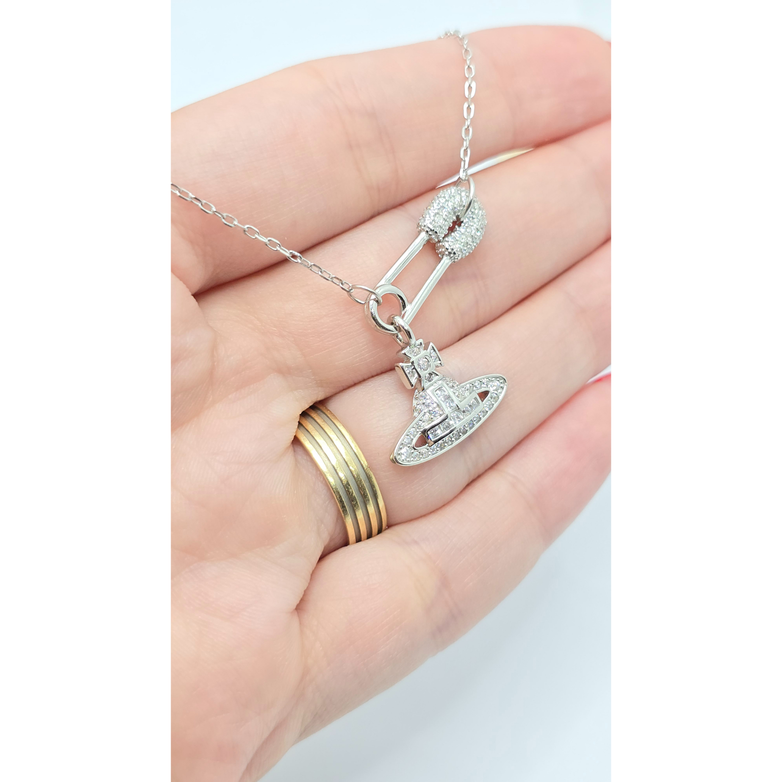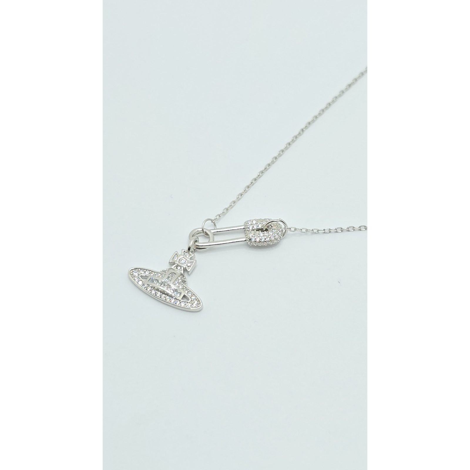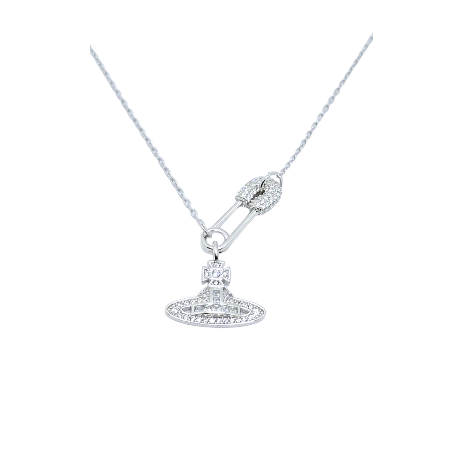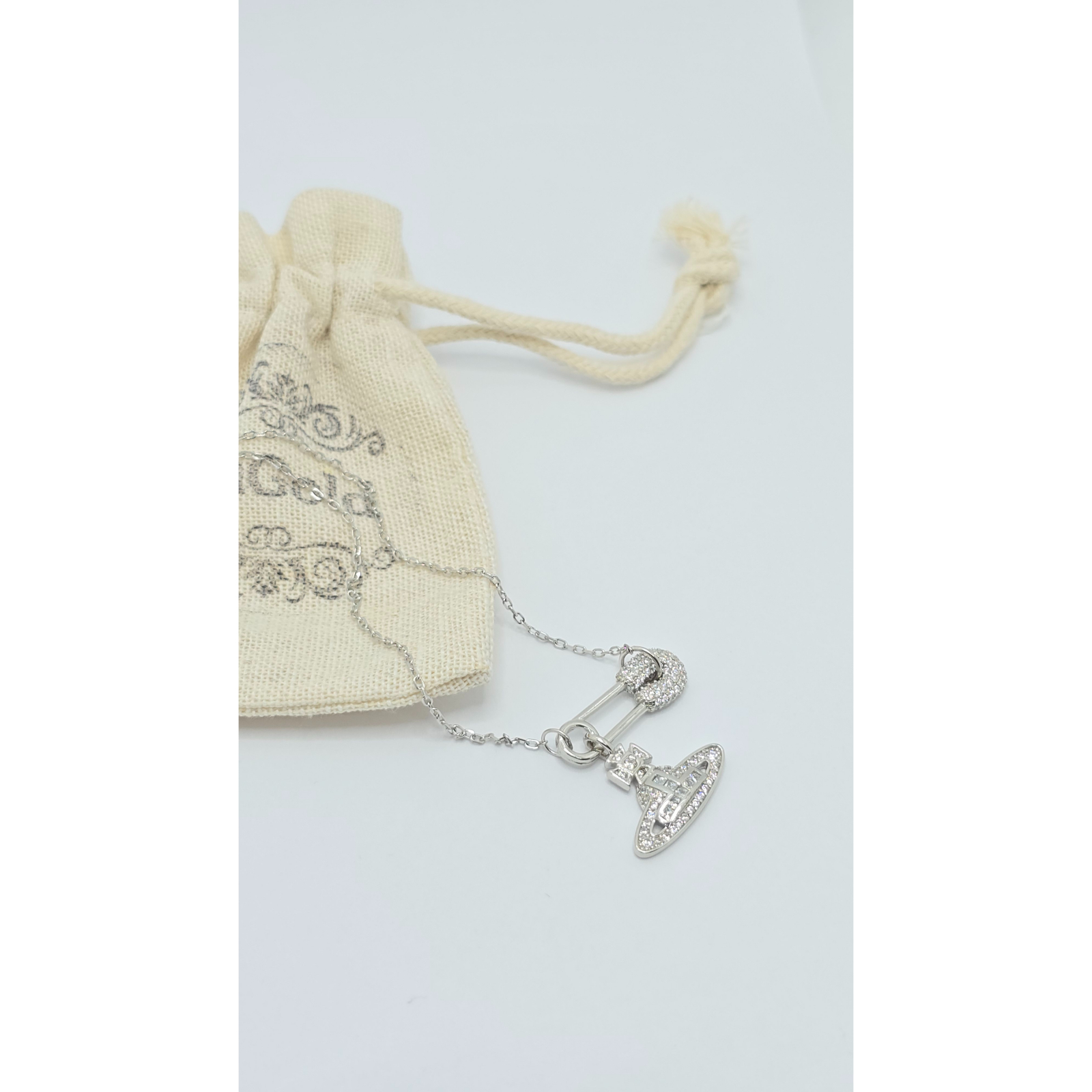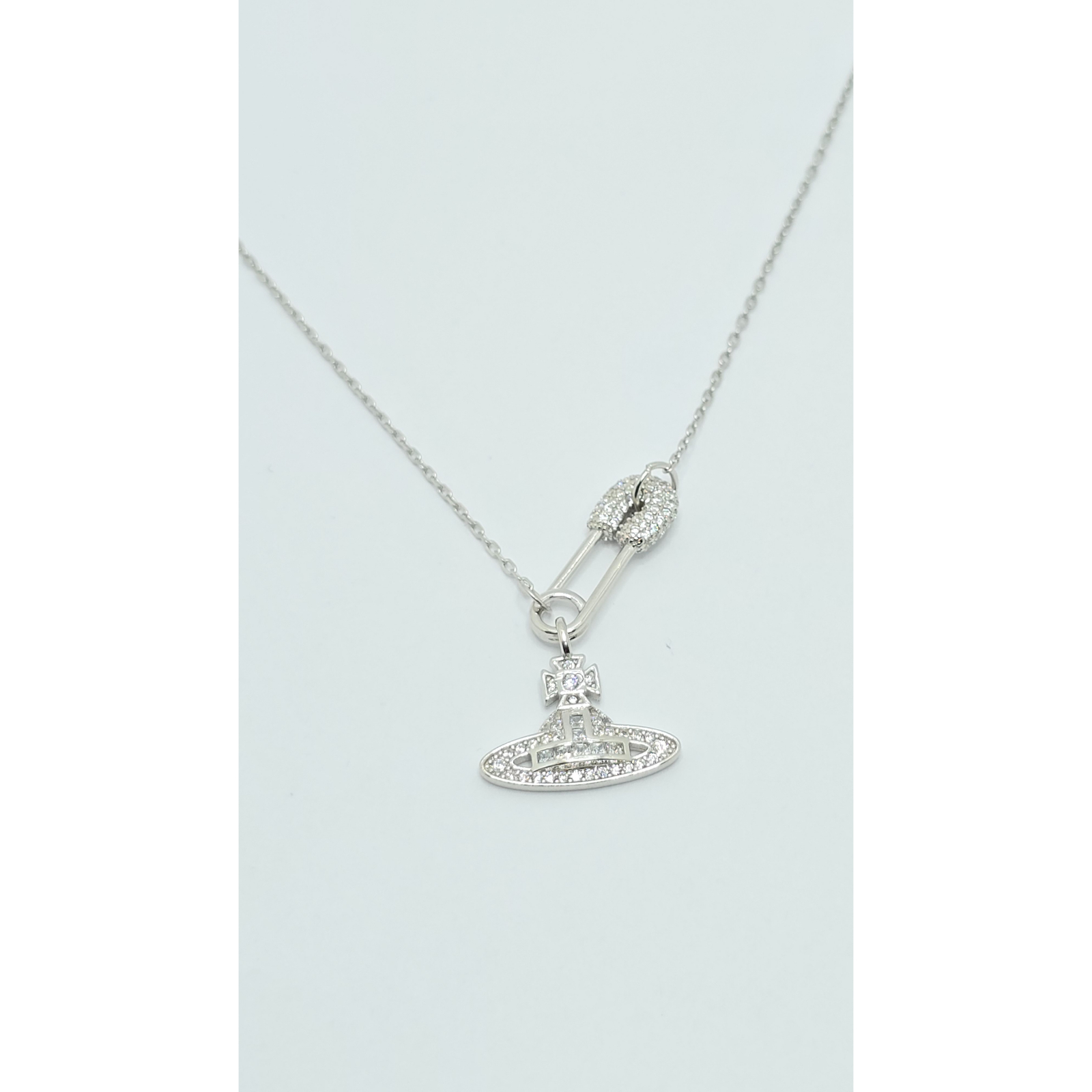 Acest lanț din argint 925 este decorat cu un medalion în formă de ac de siguranță, împodobit cu cristale zirconia, oferind un aspect modern și distinctiv, ideal pentru a adăuga un strop de originalitate oricărei ținute.