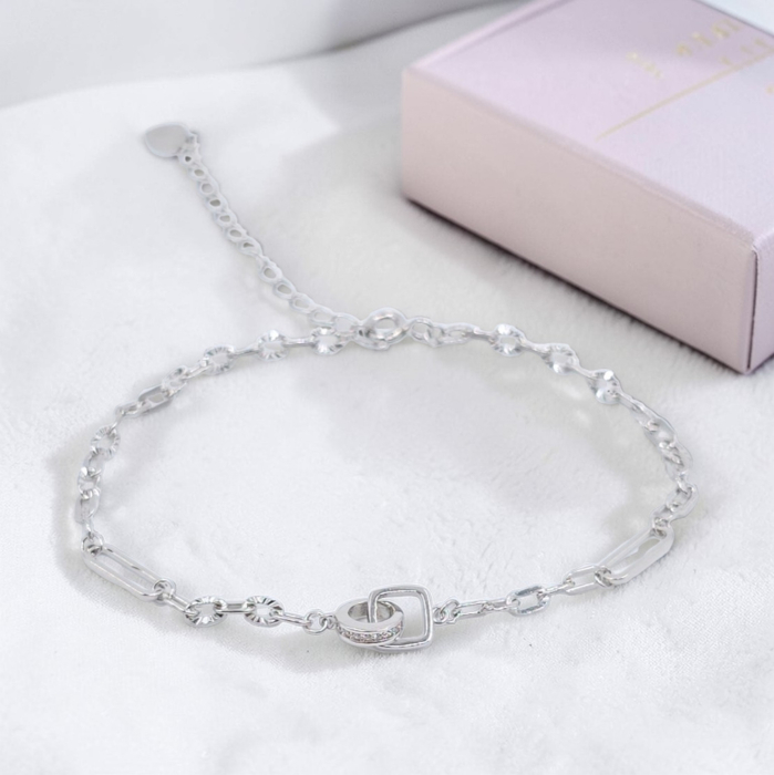 Completează-ți stilul cu această brățară din argint 925, realizată într-un design modern și minimalist, evidențiat de un element geometric central cu accente fine.
