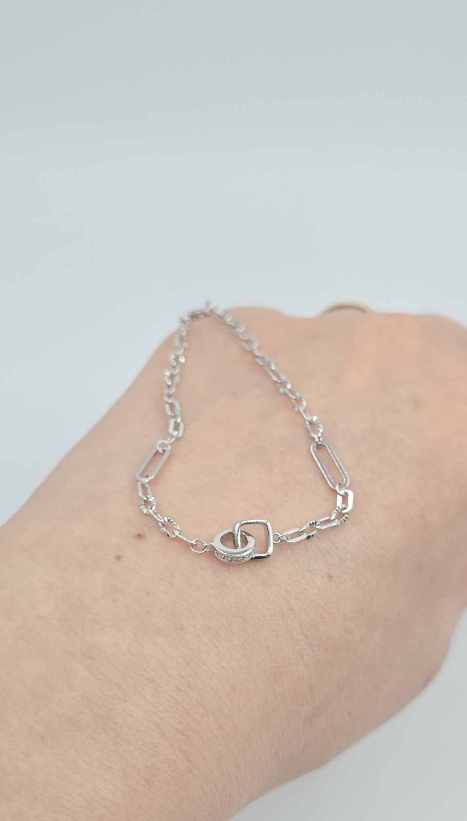 Combinația de zale diferite și detalii discrete creează un look contemporan, echilibrat și ușor de asortat. Este o bijuterie versatilă, potrivită atât pentru ținute casual, cât și elegante.