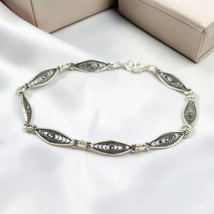 Fiecare element al brățării este fin lucrat, cu detalii decorative inspirate din stilul clasic, oferind profunzime și un aspect sofisticat. Finisajul ușor oxidat scoate în evidență modelul și conferă bijuteriei un aer elegant, atemporal.