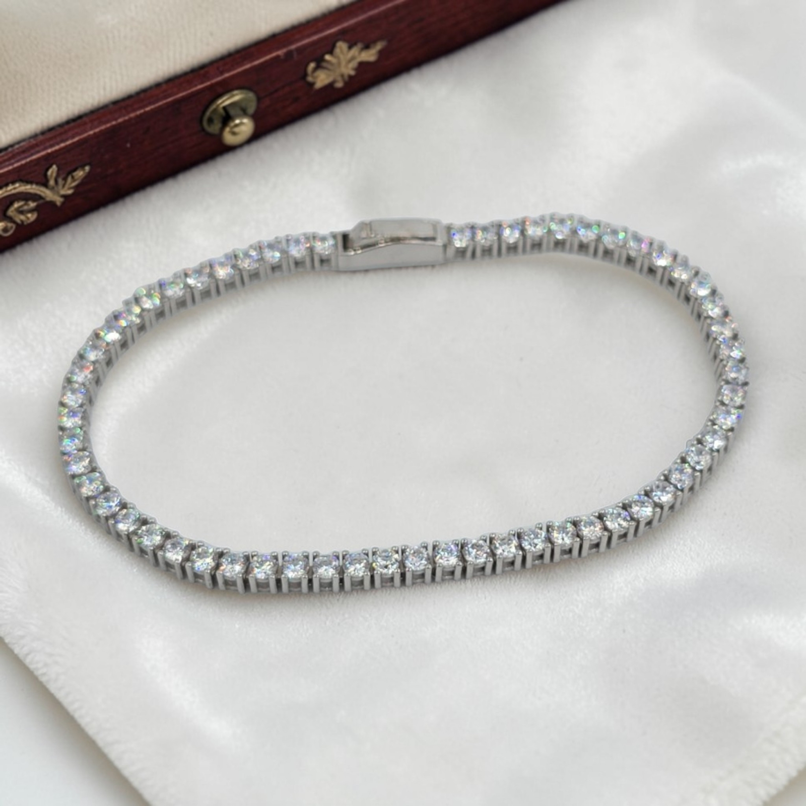 Designul continuu, format din zirconii atent montate, oferă o strălucire intensă și uniformă, asemănătoare diamantelor. Fiecare piatră reflectă lumina la fiecare mișcare, creând un efect sofisticat și rafinat.