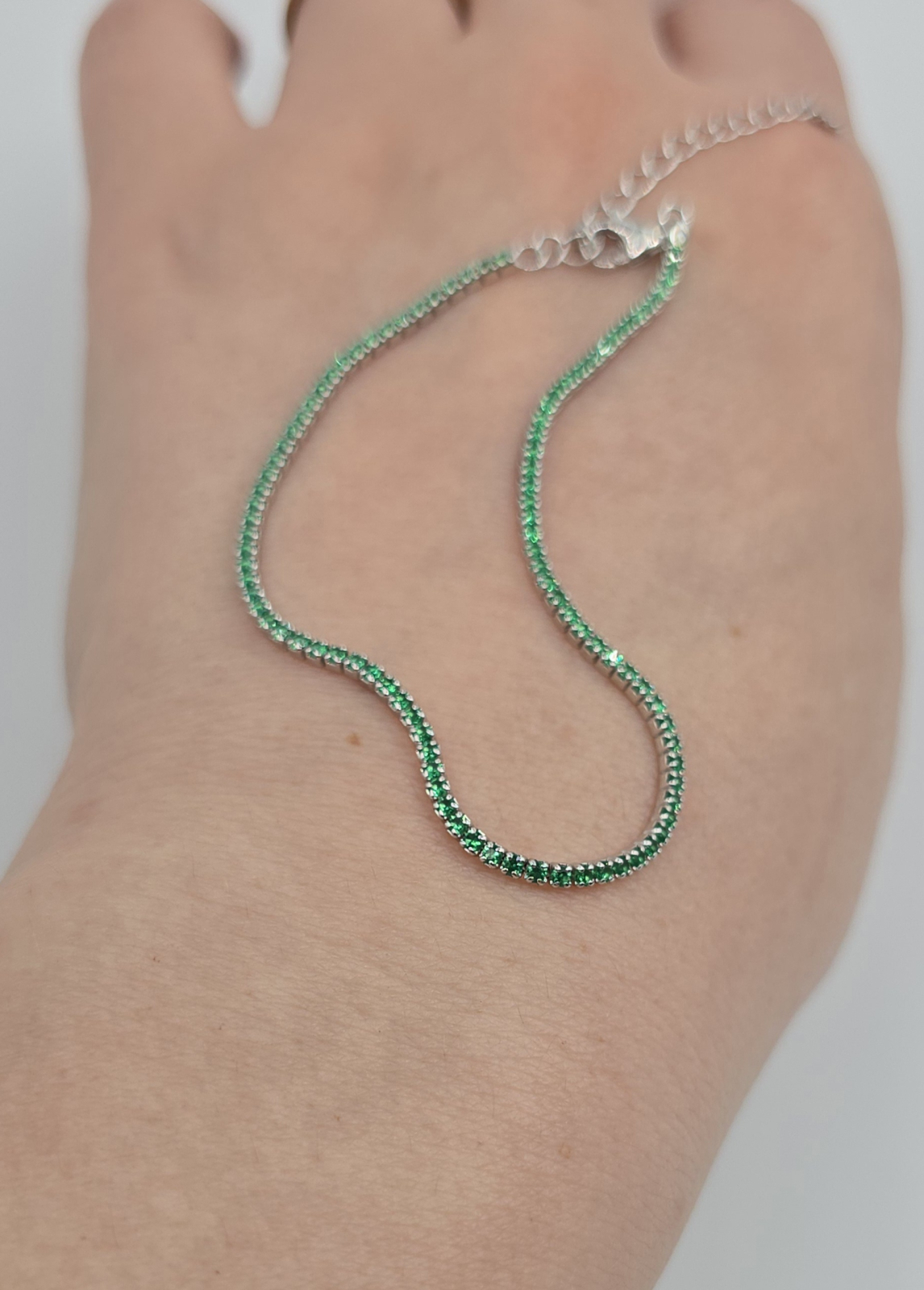 Brățară tennis elegantă din argint 925, decorată cu pietre Verzi Zirconia strălucitoare, având o lungime de 18 cm cu prelungire 20 cm și o greutate de 2.45 g. Un accesoriu sofisticat, ideal pentru orice ocazie specială.