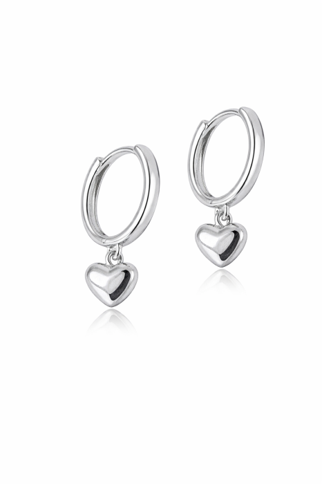Cercei din argint 925, realizați într-un design fin și feminin, tip cerc, completați de un pandantiv în formă de inimioară. Simpli, dar de efect, acești cercei adaugă un plus de delicatețe și romantism oricărei ținute.