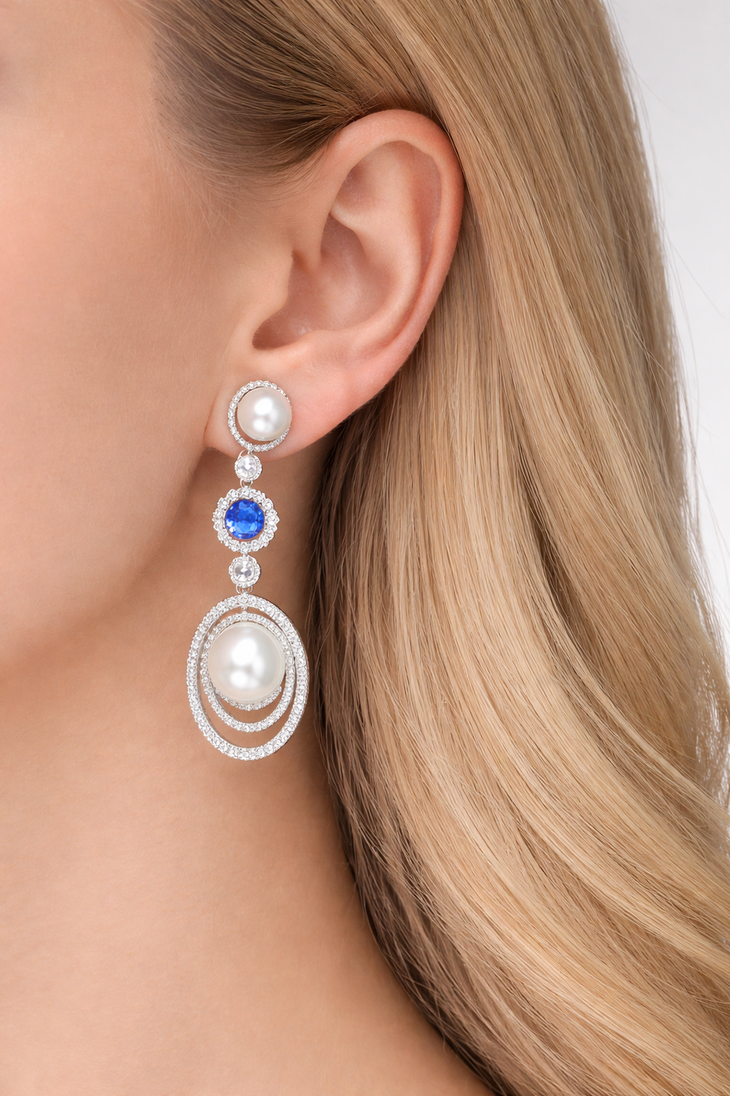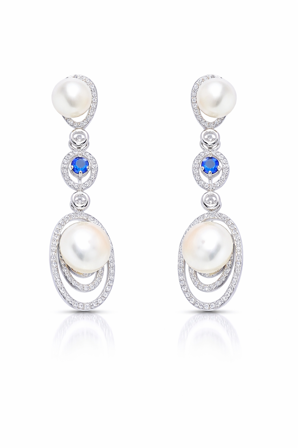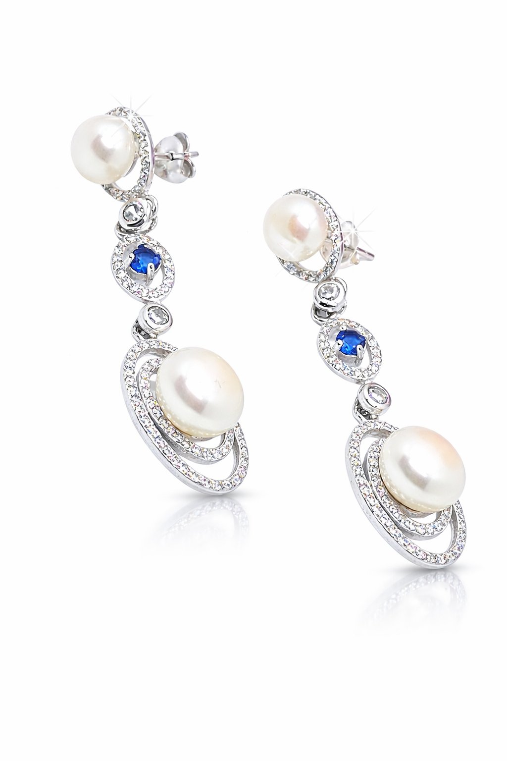 Cercei din argint 925, realizați într-un design elegant și sofisticat, decorați cu perle delicate și zirconii strălucitoare ce oferă un efect vizual spectaculos. Accentele de pietre albastre adaugă un plus de rafinament și unicitate.