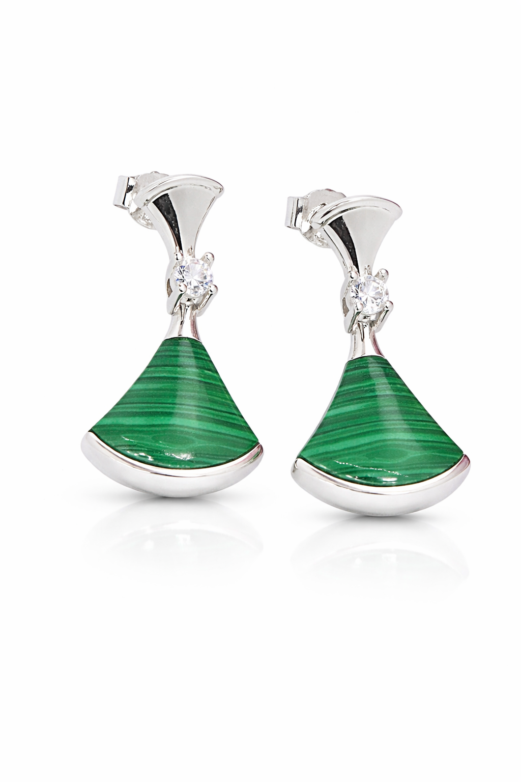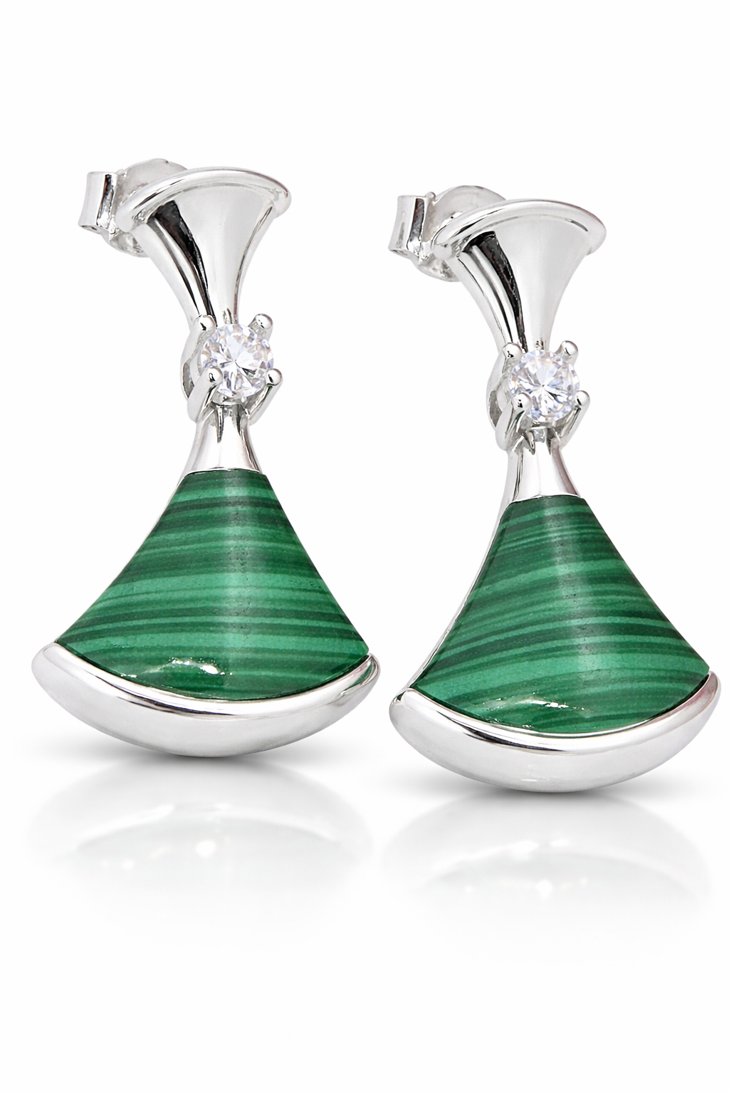 Cercei rafinați din argint 925, evidențiați prin frumusețea naturală a malachitului, recunoscut pentru dungile sale verzi unice și aspectul elegant. Designul este completat de o piatră tip zirconiu în partea superioară, care adaugă un plus de strălucire și finețe.
