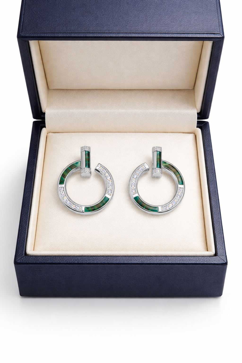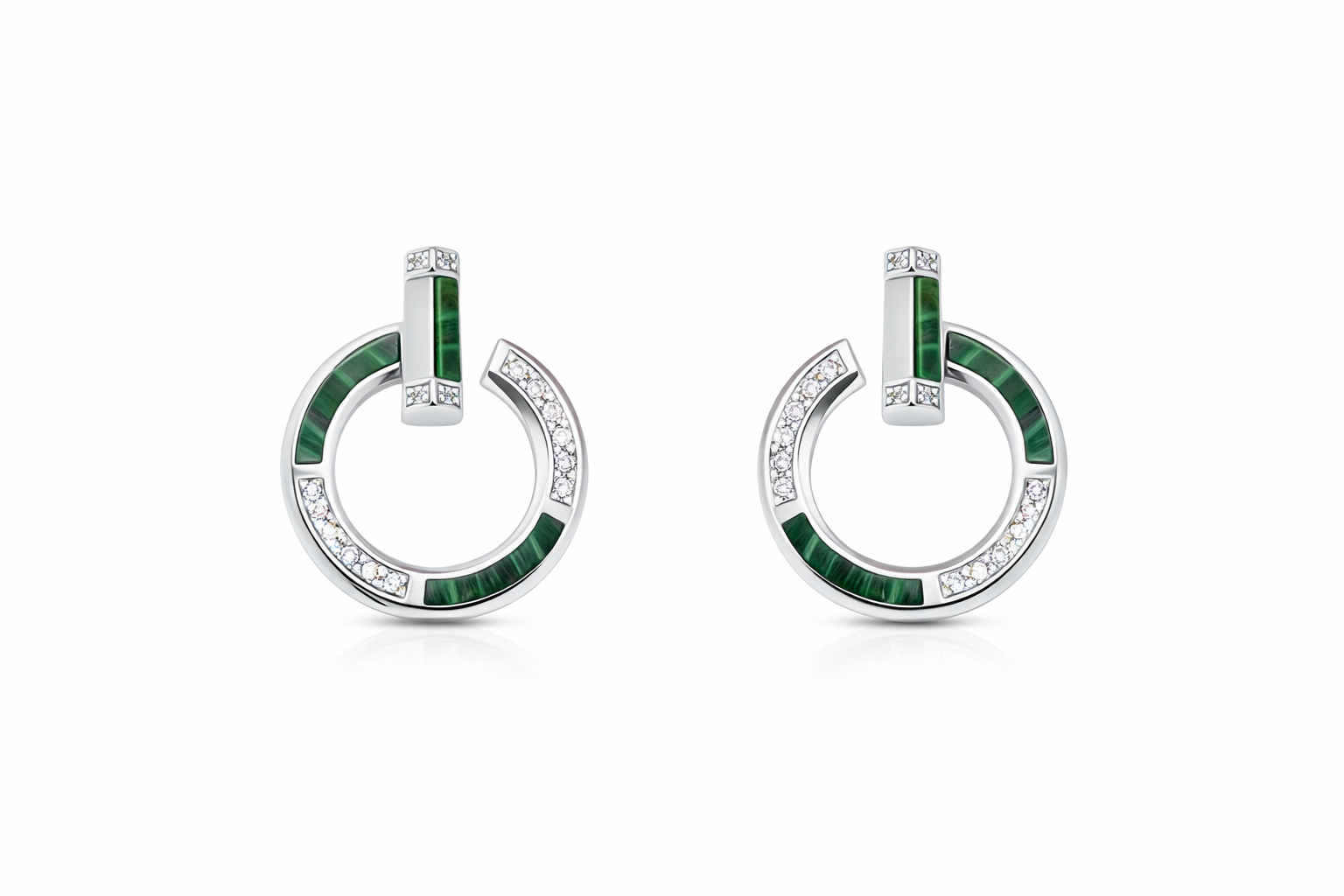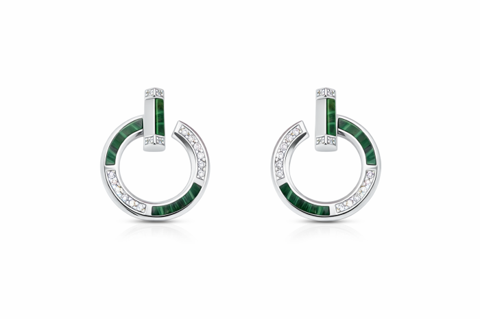 Cercei din argint 925, realizați într-un design contemporan și elegant, evidențiați prin inserții de malachit cu nuanțe intense de verde și detalii fine cu zirconii strălucitoare.