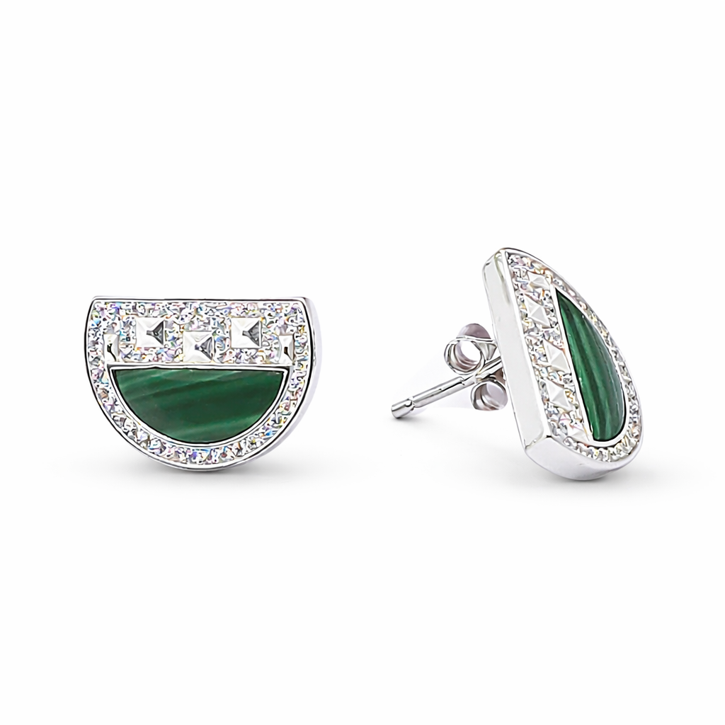 Cercei eleganți din argint 925, realizați într-un design sofisticat, ce îmbină frumusețea naturală a malachitului cu strălucirea intensă a zirconiilor.