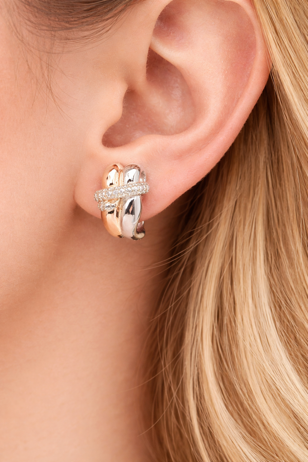 Cercei din argint 925, realizați într-un design modern și sofisticat, evidențiați prin combinația elegantă dintre finisajul argintiu și accentele aurii. Modelul este completat de detalii fine cu zirconii, ce oferă un plus de strălucire și rafinament.