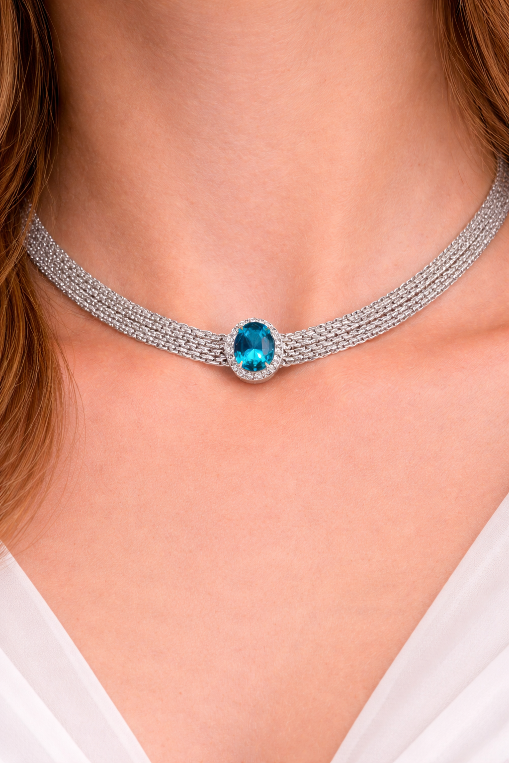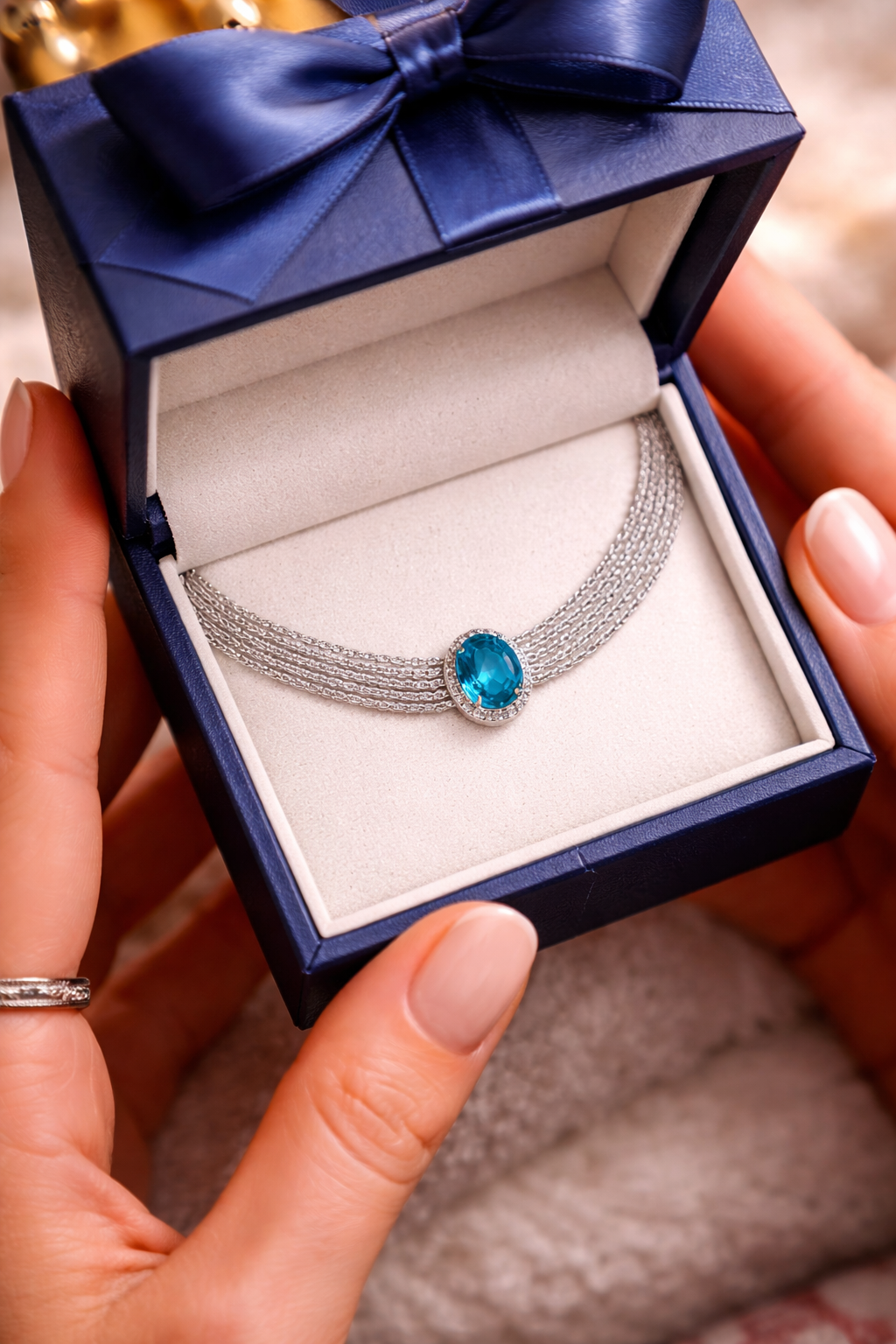 Piatra centrală, într-o nuanță intensă de albastru, captează lumina din orice unghi, oferind un efect spectaculos și un aer de lux. Montura fină și lanțul bogat lucrat adaugă volum și prezență, transformând acest colier într-o bijuterie statement, ideală atât pentru ținute elegante, cât și pentru momente speciale.