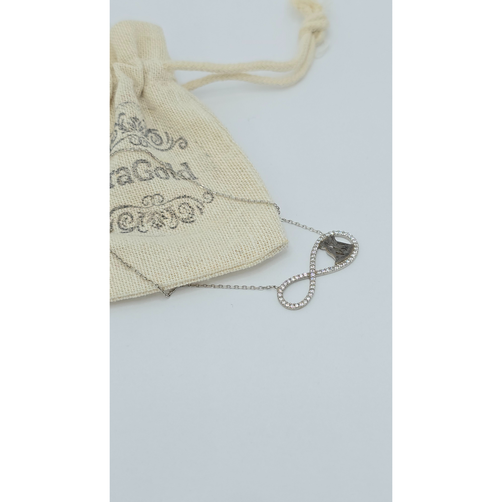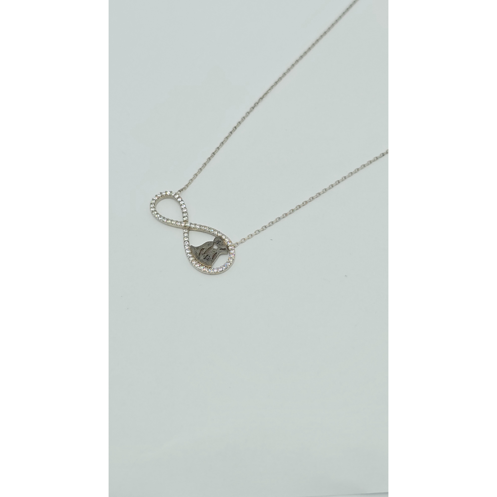 Acest lanț din argint 925 are un medalion în formă de infinit, decorat cu cristale zirconia și siluete de îndrăgostiți, simbolizând iubirea eternă și legăturile puternice, perfect pentru a adăuga un strop de rafinament oricărei ținute.